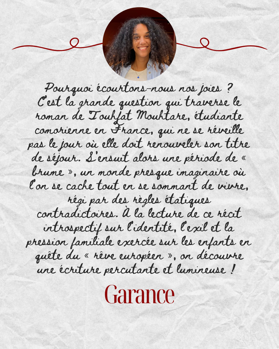 Alors que sa vie bascule sous le règne de la clandestinité et du qui-vive permanent, Touhfat Mouhtare s'interroge : d'où vient cette sensation de familiarité avec la crainte d'être démasquée, le sentiment d'urgence, la nécessité de ne surtout pas laisser la joie s'installer ?