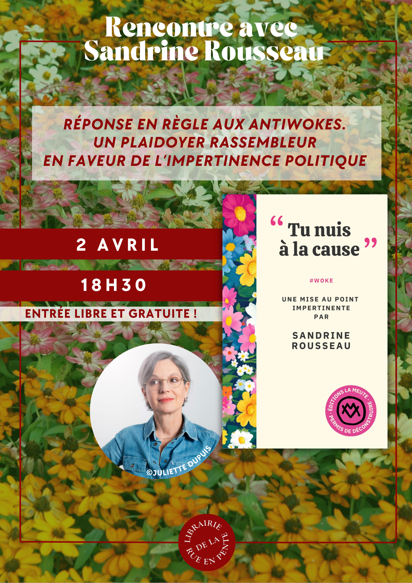 Le jeudi 2 avril, nous recevrons Sandrine Rousseau qui nous parlera de son nouvel essai “ Tu nuis à la cause”, qui a pour vocation d’être une réponse en règle aux antiwokes et un plaidoyer rassembleur en faveur de l’impertinence politique.