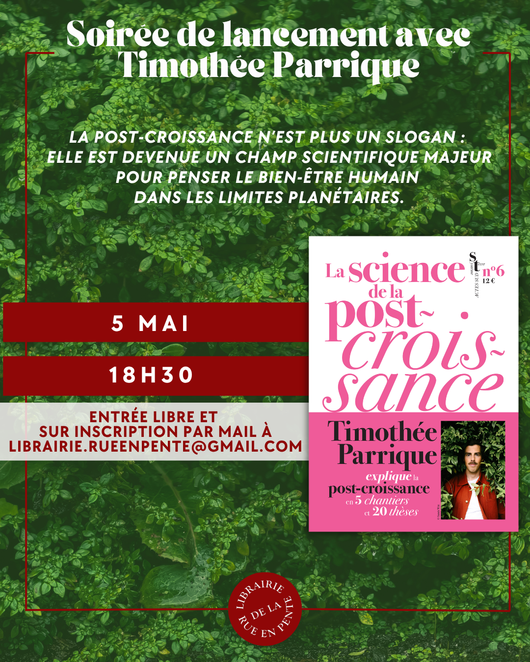 RDV le 05/05/2026 à 18h30 - Entrée libre et sur inscription par mail à librairie.rueenpente@gmail.com.